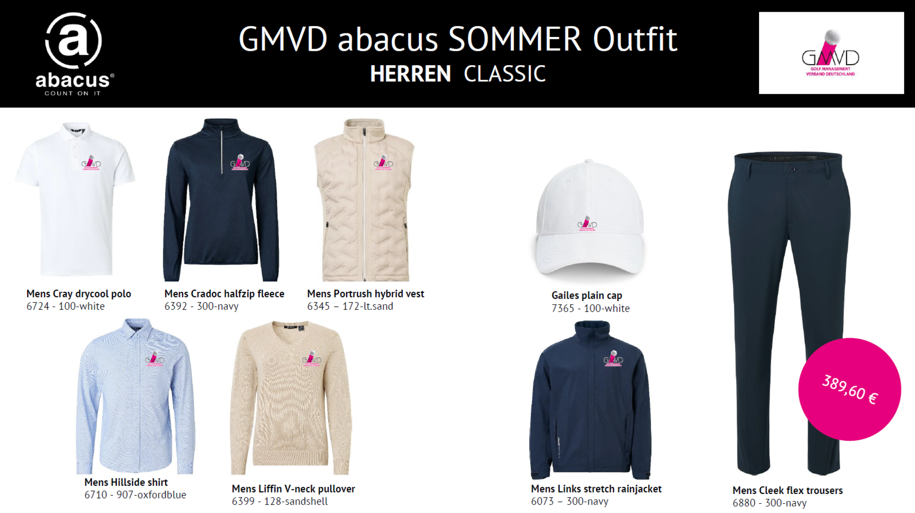 - immer inklusive des GMVD-Logo, gestickt, auf allen Teilen (außer Hosen!), entweder auf der linken Brust oder dem linken Ärmel