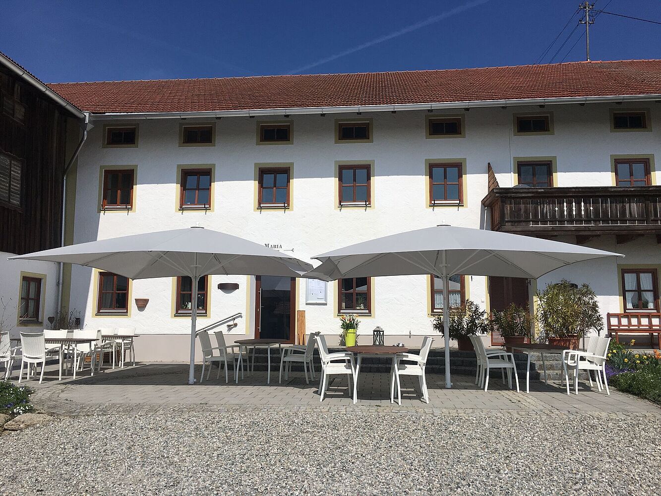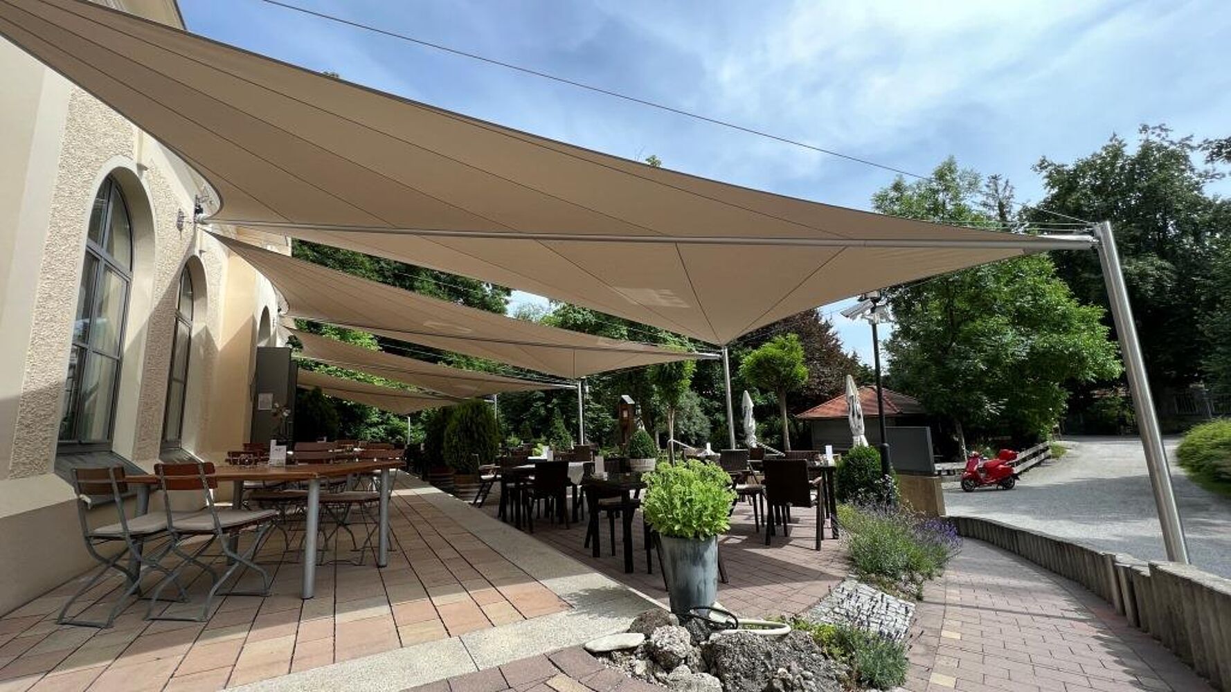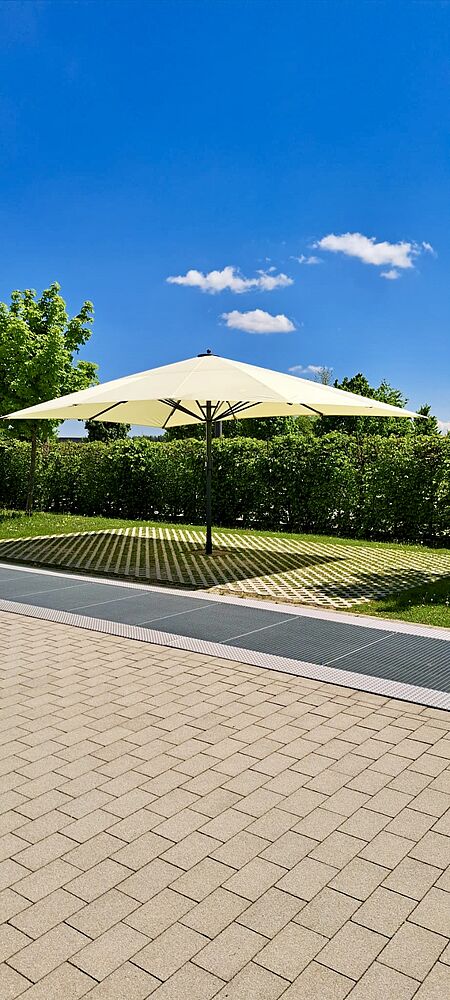 Auch die windstabilen Allwetterschirme bieten nicht nur zuverlässigen UV- und Regenschutz, sondern eine klare architektonische Linie – perfekt integriert ins Landschaftsbild.