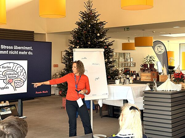 Ab 12:30 Uhr folgte der Vortrag der Gastreferentin Frauke Hautz. Als Neurowissenschaftlerin, Emotionscoach und zertifizierte ganzheitliche Gesundheitsberaterin sprach sie über das Thema „Klar im Kopf – Stark im Alltag“. Frauke Hautz vermittelte wertvolle Impulse, wie Mitarbeiter:innen in den Geschäftsstellen mit Stress, Druck und mentaler Belastung besser umgehen können. Der Vortrag war abwechslungsreich gestaltet und bot durch praktische Übungen, kurze Reflexionsphasen und den Austausch in Kleingruppen einen spürbaren Mehrwert für alle.
